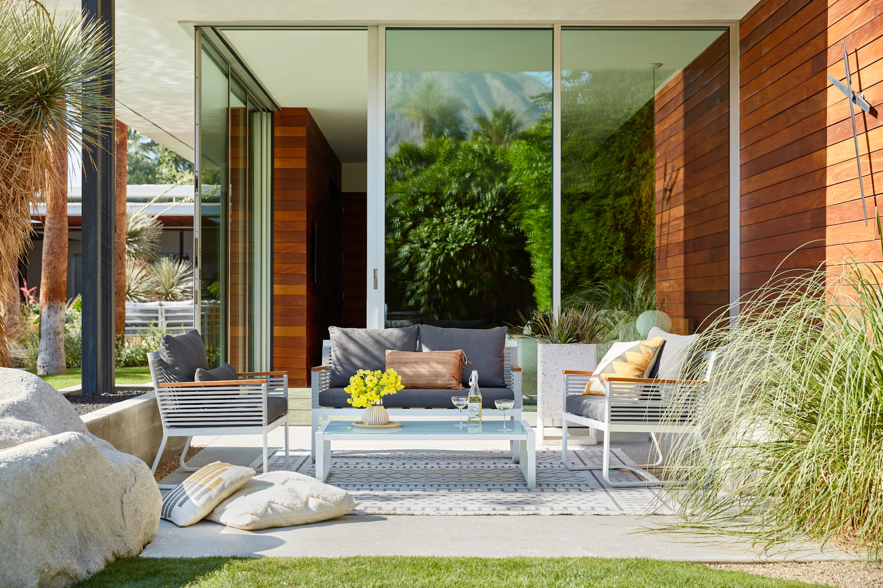 Sometimes the best seat in the house isn’t even inside your home. This outdoor sofa features a white frame with contrasting dark gray cushions, light gray woven sides, and medium tone wood arms rest, for a unique way to lounge.